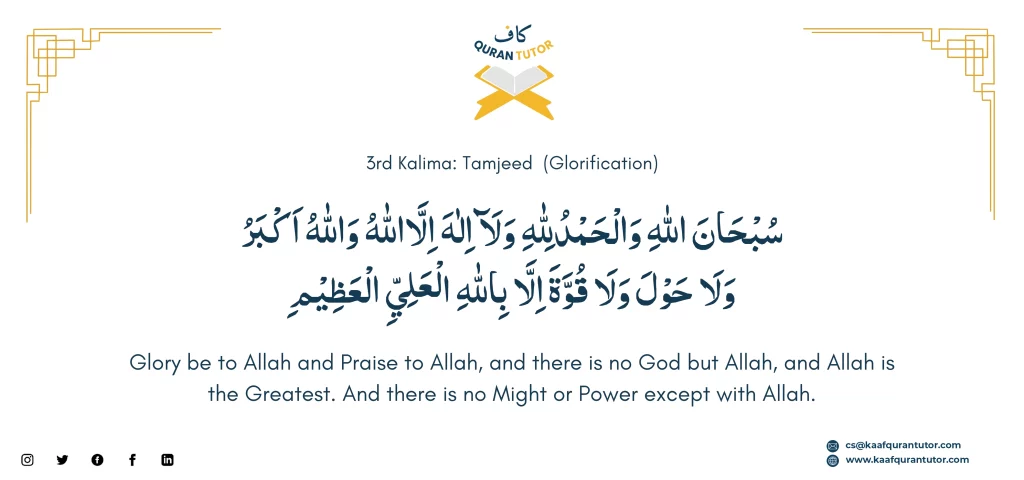 Transliteration: Subhanallahe Wal Hamdulillahe Wa Laa ilaha illal Laho Wallahooakbar. Wala Haola Wala Quwwata illa billahil AliYil Azeem.
