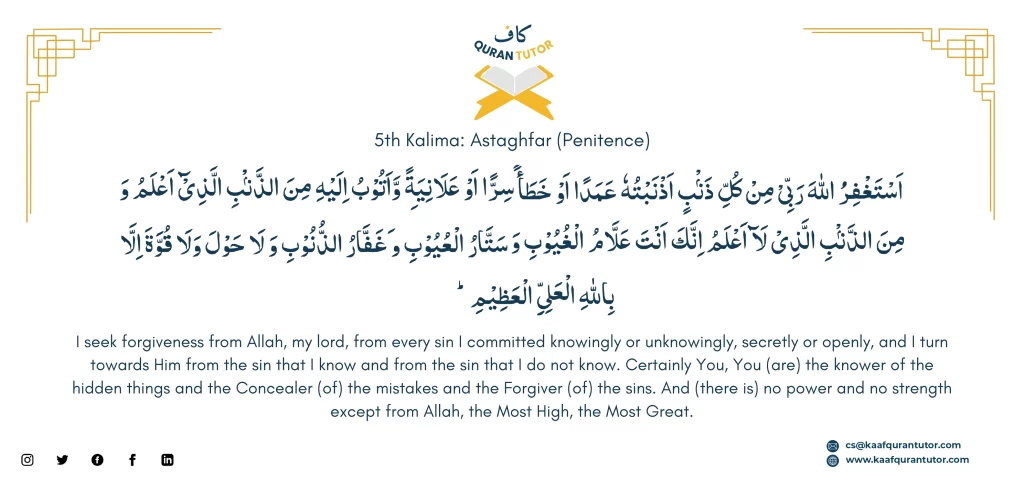 Transliteration: Astaghfirullah Rabbi Min Kullay Zambin Aznabtuho Amadan Ao Khat An Sirran Ao Alaniatan Wa Atoobo ilaihe Minaz Zambil Lazee Aalamo Wa Minaz Zambil Lazee La Aalamo innaka Anta Allamul Ghuyoobi Wa Sattaarul Oyobi Wa Ghaffaruz Zunoobi Wala Haola Wala Quwwata illa billahil AliYil Azeem.