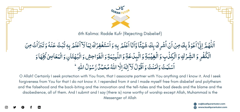 Transliteration: Allah Humma inni Aaoozubika Min An Oshrika Beka Shai Aown Wa Anaa Aalamo Behi Wa Astaghfiroka Lima laa Aalamo Behi Tubtu Anho Wa Tabarrato Minal Kufri Washshirki Wal Kizbi Wal Jheebati Wal Bidaati Wan Nameemati Wal Fawahishi Wal Bohtani Wal Maasi Kulliha Wa Aslamtoo Wa Aamantoo Wa Aqoolo Laa ilaaha illal Lahoo Mohammadur Rasool Ullah.